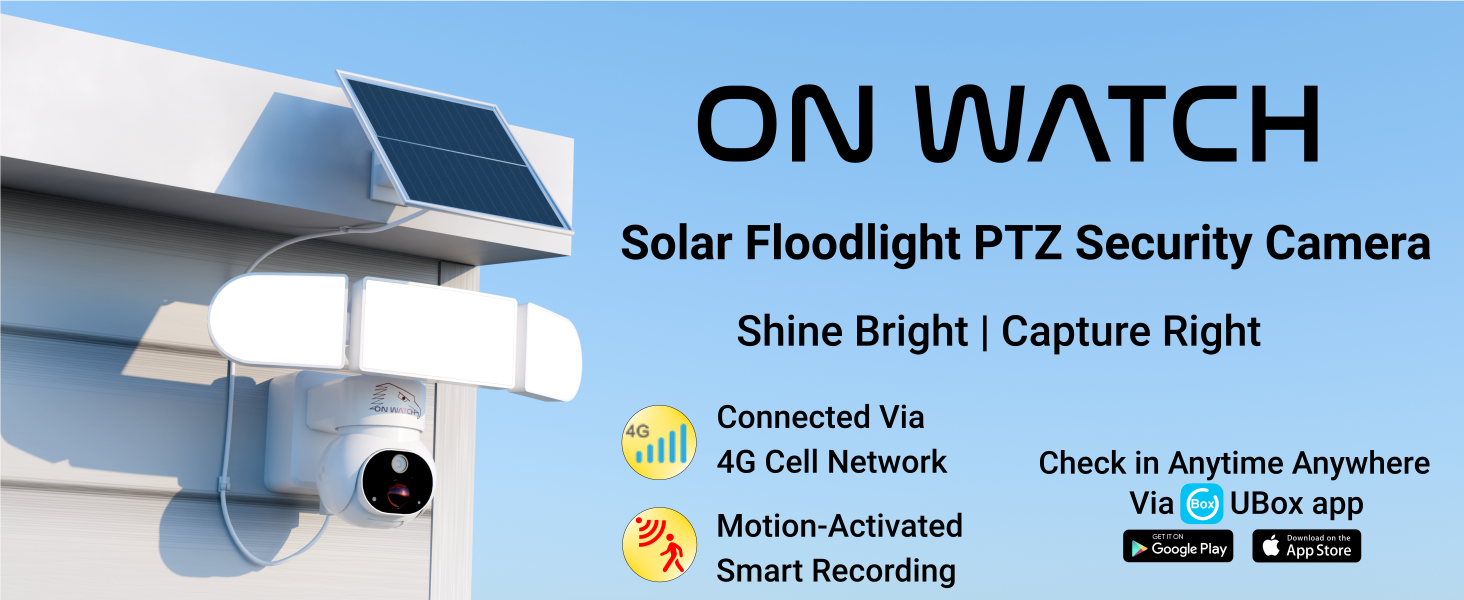 ON WATCH 4G LTE No WiFi Solar Floodlight Camera, Motion-Activated Recording/Notification/Floodlight/Siren, Pan/Tilt, 2K, Two-Way Talk, 64 GB Storage