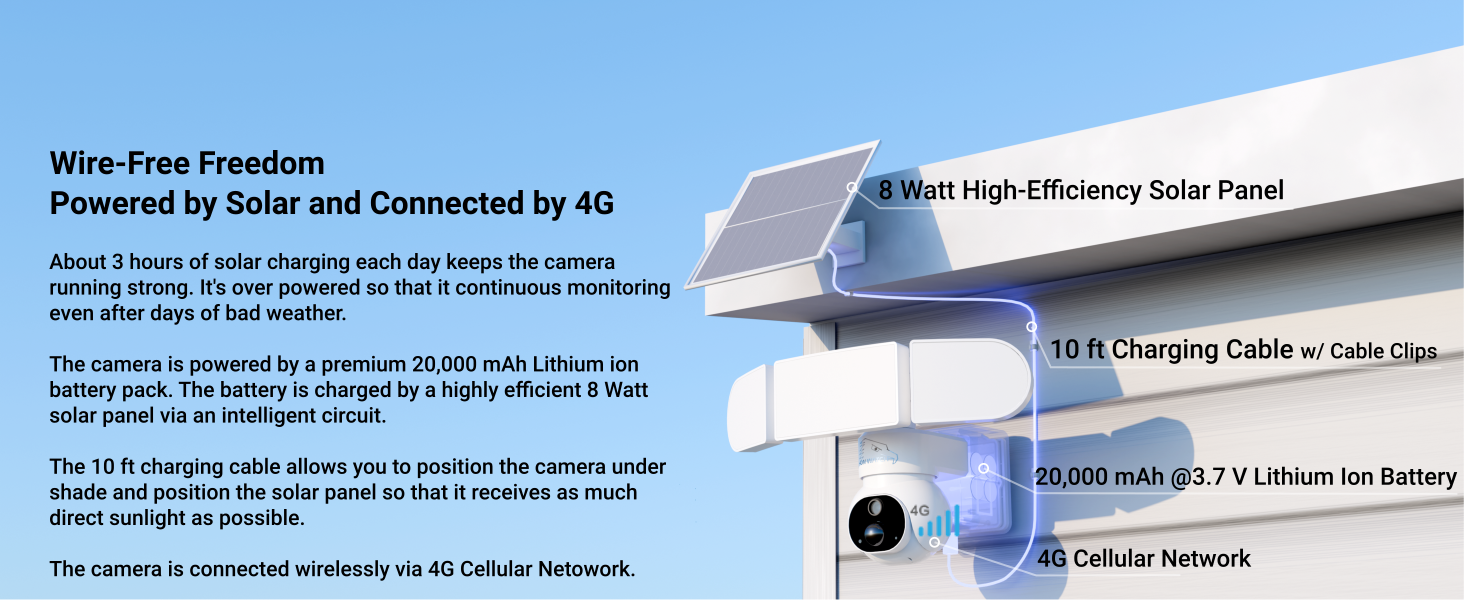 • Powered by one 8 Watt high-efficiency solar panel and a 20000 mAh battery Lithium ion rechargeable battery The high efficiency solar panel with 3-4 hours of direct sunlight exposure each day can keep the camera sufficiently charged. The 10-ft power cable from solar panel allows for optimal position of the solar panel. The large capacity battery provides redundancy so that the camera continues working after days of rain or overcast.