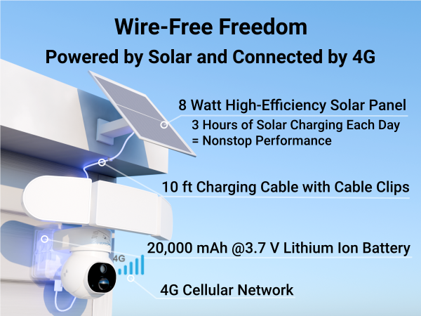 • Connected via 4G LTE Cellular Network (NO WiFi) and powered by sunshine Install it anywhere with 4G coverage and sunshine without the hassle of hard-wiring. Perfect for remote properties, job sites, farms, wild life observatories, etc. For best results, ensure at least two-bar 4G signal at the location where you mount the camera. Signal strength can be viewed in the app.