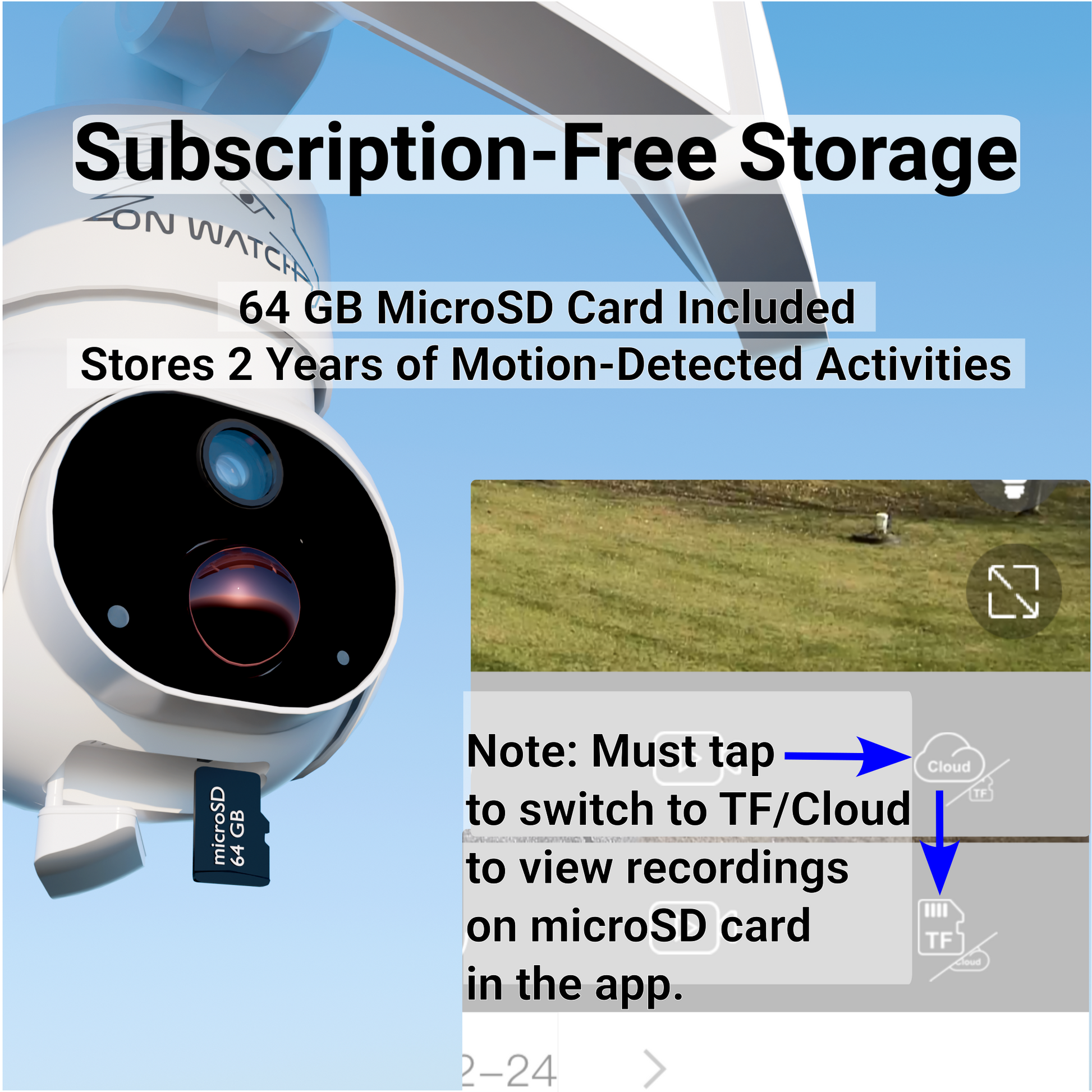 • Two video storage options Besides local MicroSD card storage, you can consider cloud storage (subscription needed) or both MicroSD card and cloud storage for critical areas. Recordings can be downloaded to your phone or other smart devices.